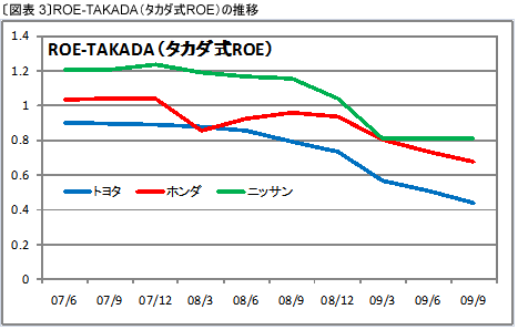 ただし、緑色のニッサン(日産自動車)が健闘しているのに対し、青色のトヨタ(トヨタ自動車)の凋落ぶりが著しい点に注目しておいて欲しい。トヨタについては、リコール問題が起きるはるか以前(〔図表 3〕では07年6月期)、すでに業績に黄色信号が点滅していたようだ。〔図表 1〕で示したROEではわからなかった特徴を、〔図表 3〕のROE-TAKADAは炙り出している。