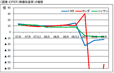 次の〔図表 4〕は、PERの実績値の推移を描いたものだ。08/12(08年12月期)までは3社とも10倍前後で推移していたが、09年以降、見事に崩壊していることがわかる。