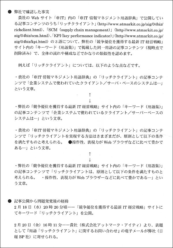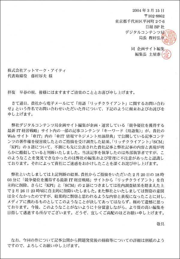 株式会社アットマーク・アイティは、日経BP社に対して一部の記事コンテンツについての著作権侵害を指摘しました。この件について、日経BP社より謝罪と経緯を表した書面を受け取りましたので、以下のようにお知らせします。